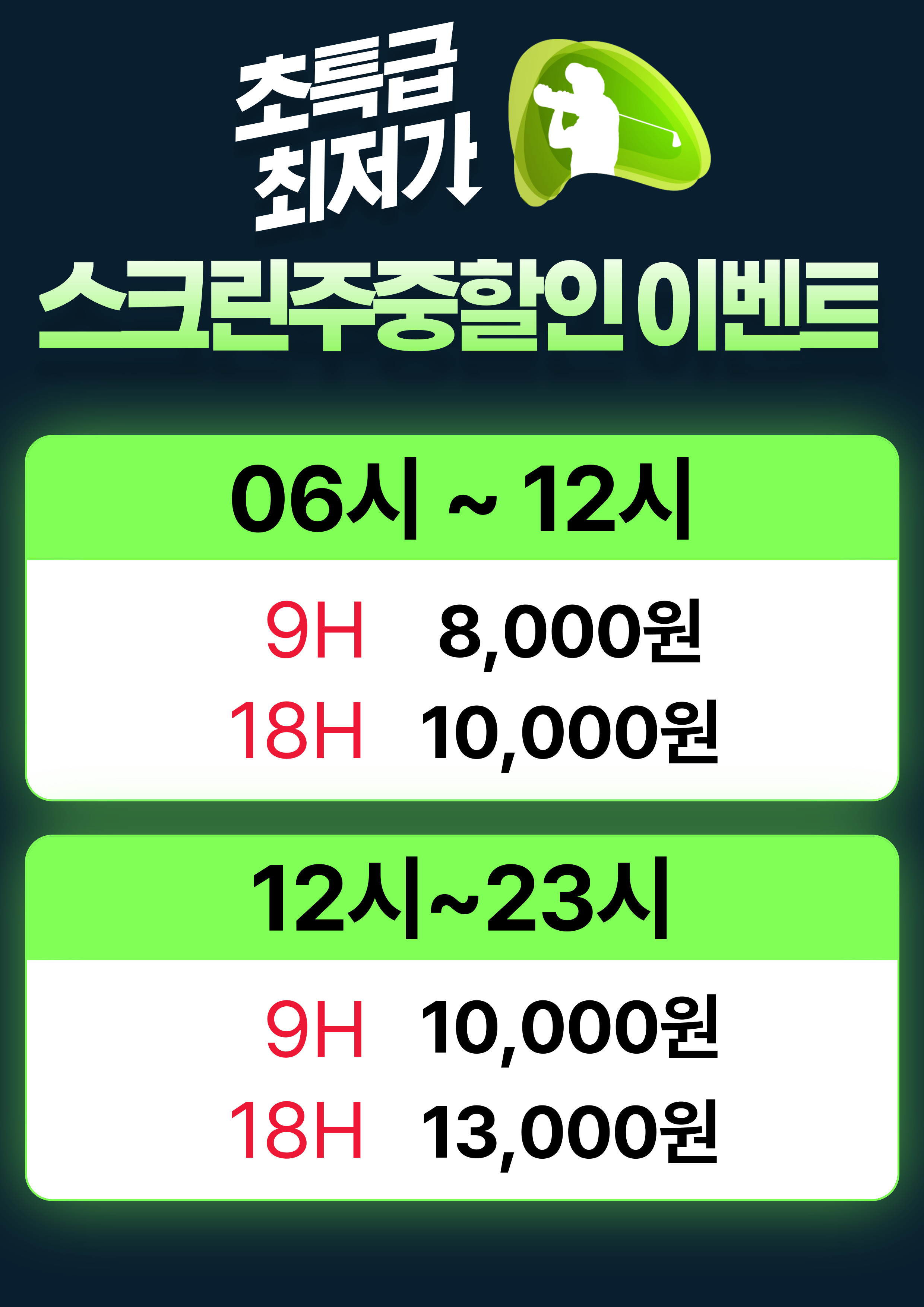 06시~12시 👉 9홀 8,000원 / 18홀 10,000원 12시~23시 👉 9홀 10,000원 / 18홀 13,000원